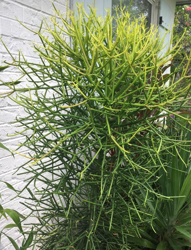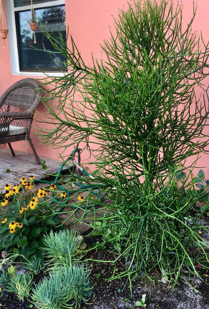 This pencil cactus was one foot tall when purchased four years ago. For the first three years, he lived in ceramic pots increasing in size as he rapidly grew. He was three feet tall when I planted him in the ground in March 2020 and is now close to five feet tall. This variety of pencil cactus stays green regardless of season or amount of sunlight.